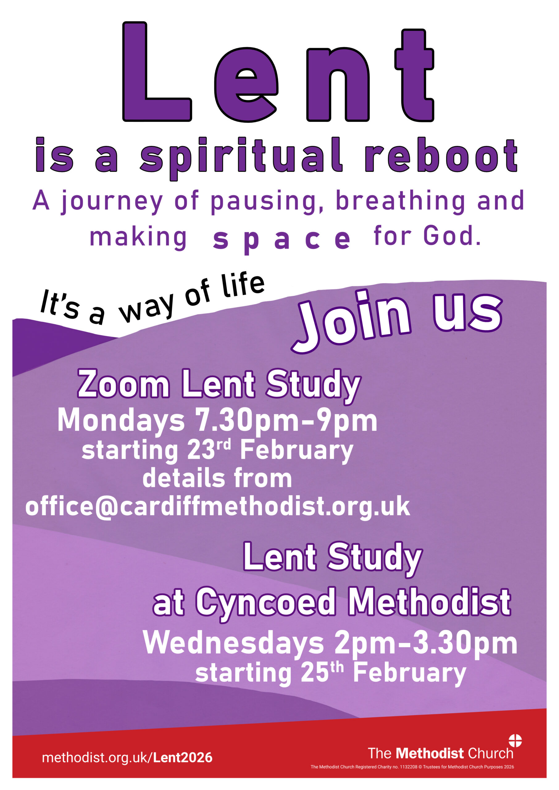Lent Study Event Date: February 25, 2026 Time: 2.00pm Location: Cyncoed Methodist Church Address: Cyncoed Road /Westminster Cresc Cardiff CF23 6SE